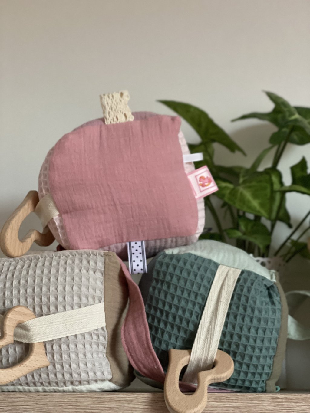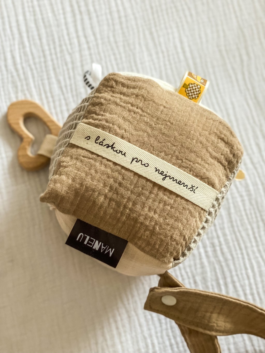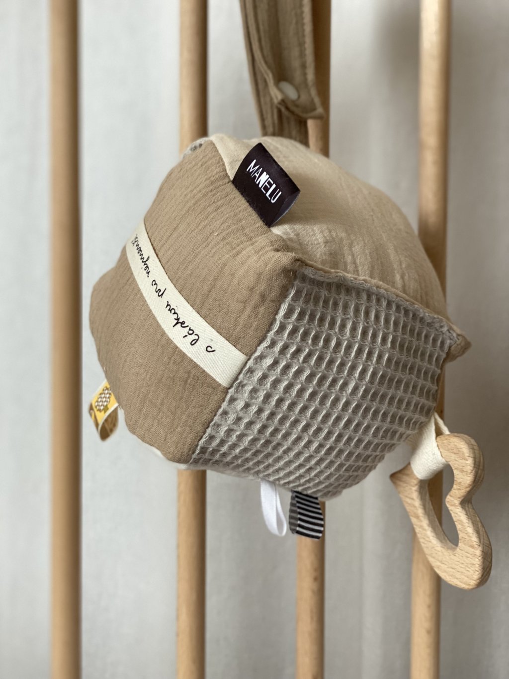 Kostka je ze 100% bavlny, vyplněna antialergením dutým vláknem, interaktivní prvky s atestací pro děti do 3 let.