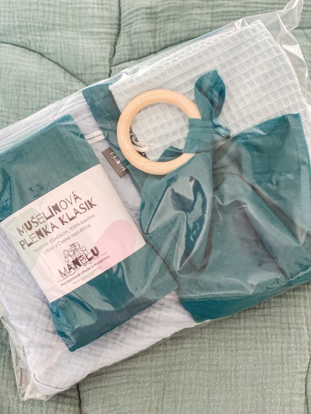 - 🛁 Mušelínovou osušku – hebká, savá a příjemná i pro nejcitlivější pokožku