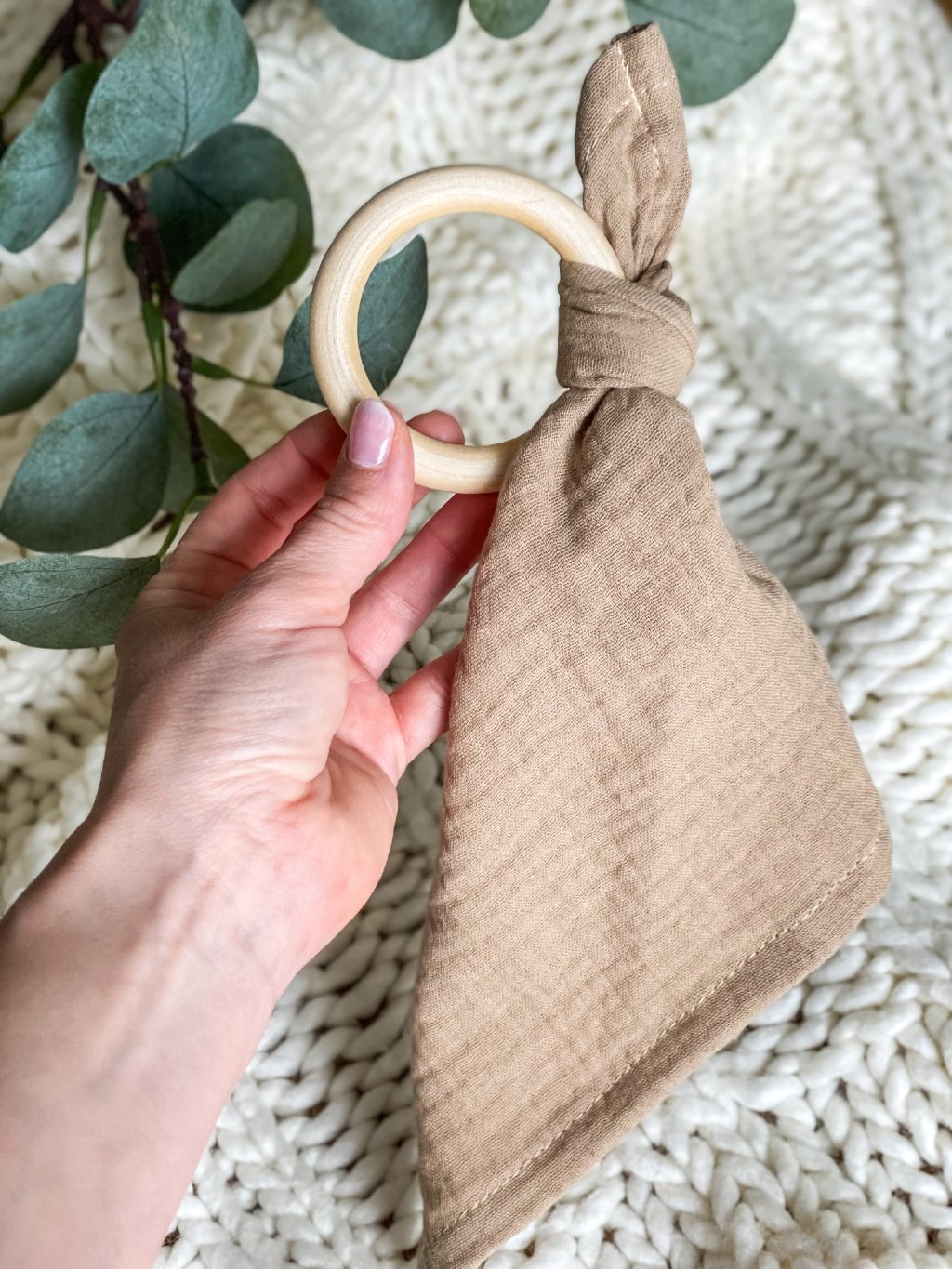 1x Muchlínka - kamarád na hraní a muchlání při usínání pro miminka :) mušelínová miniplenka 25x25cm na dřevěném kroužku.